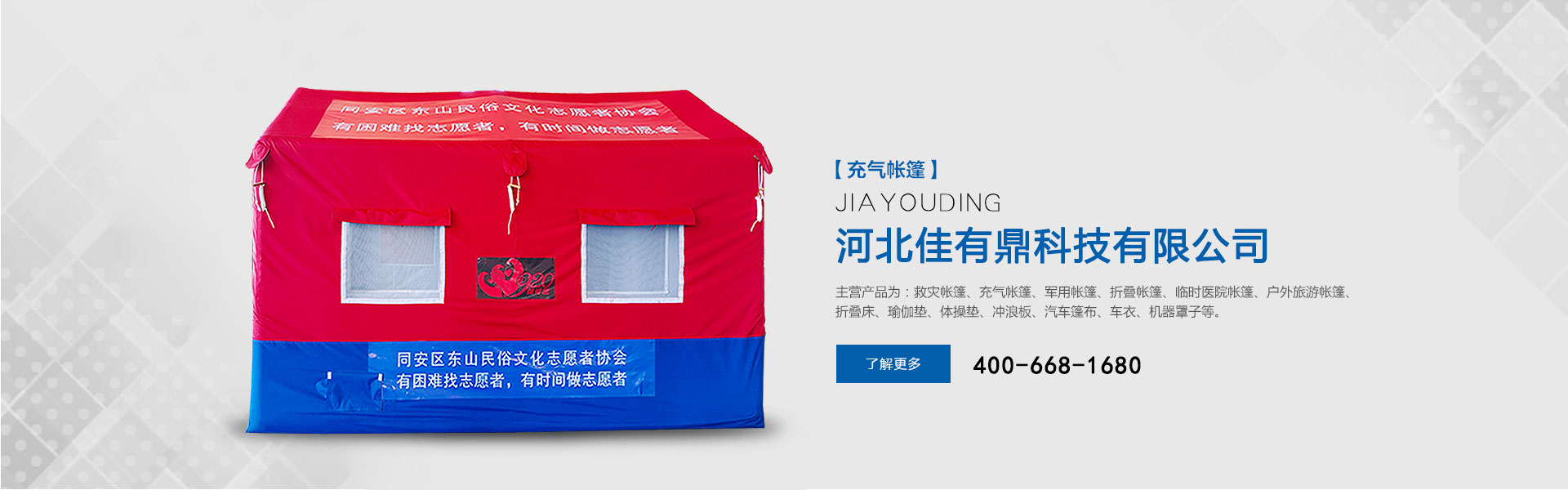 主營產(chǎn)品為:救災(zāi)帳篷、充氣帳篷、軍用帳篷、折疊帳篷、臨時醫(yī)院帳篷、戶外旅游帳篷、折疊床、瑜伽墊、體操墊、沖浪板、汽車篷布、車衣、機(jī)器罩子等。